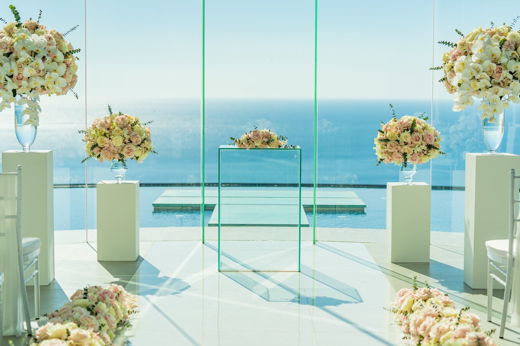 Decorated wedding venue (Fresh flowers at aisle and altar)